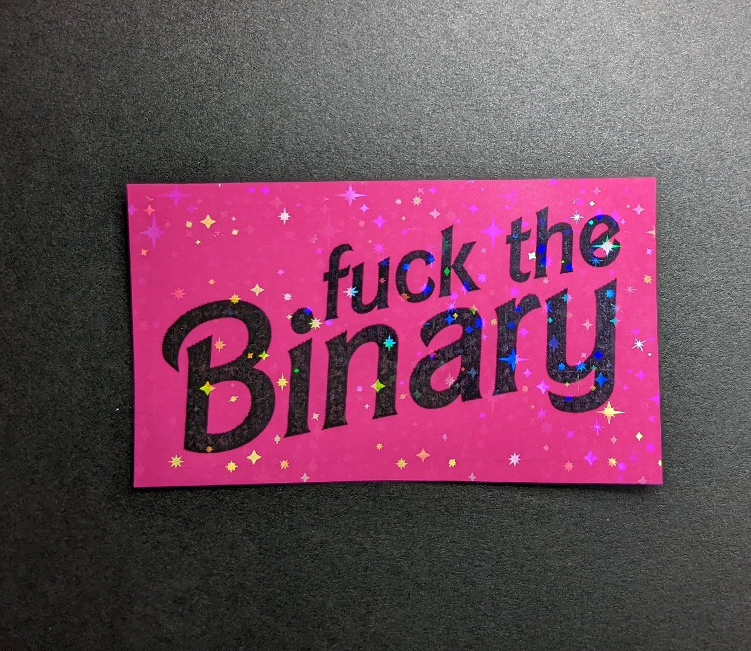 [image description: hot pink, sparkly sticker with the text "fuck the Binary"]