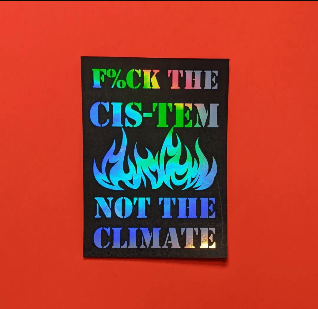 [image description: 4 stickers with a flame graphic & the text 'f%ck the cis-tem', not the climate']