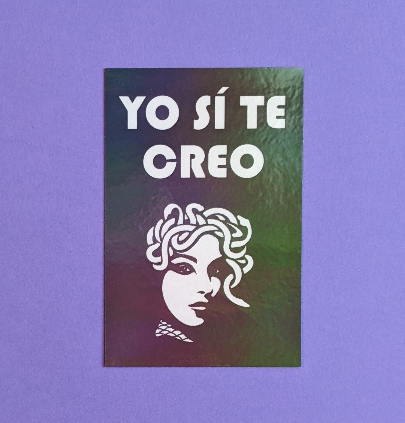[image description: black sticker with an image of medusa and the text, ‘yo sí te creo’]